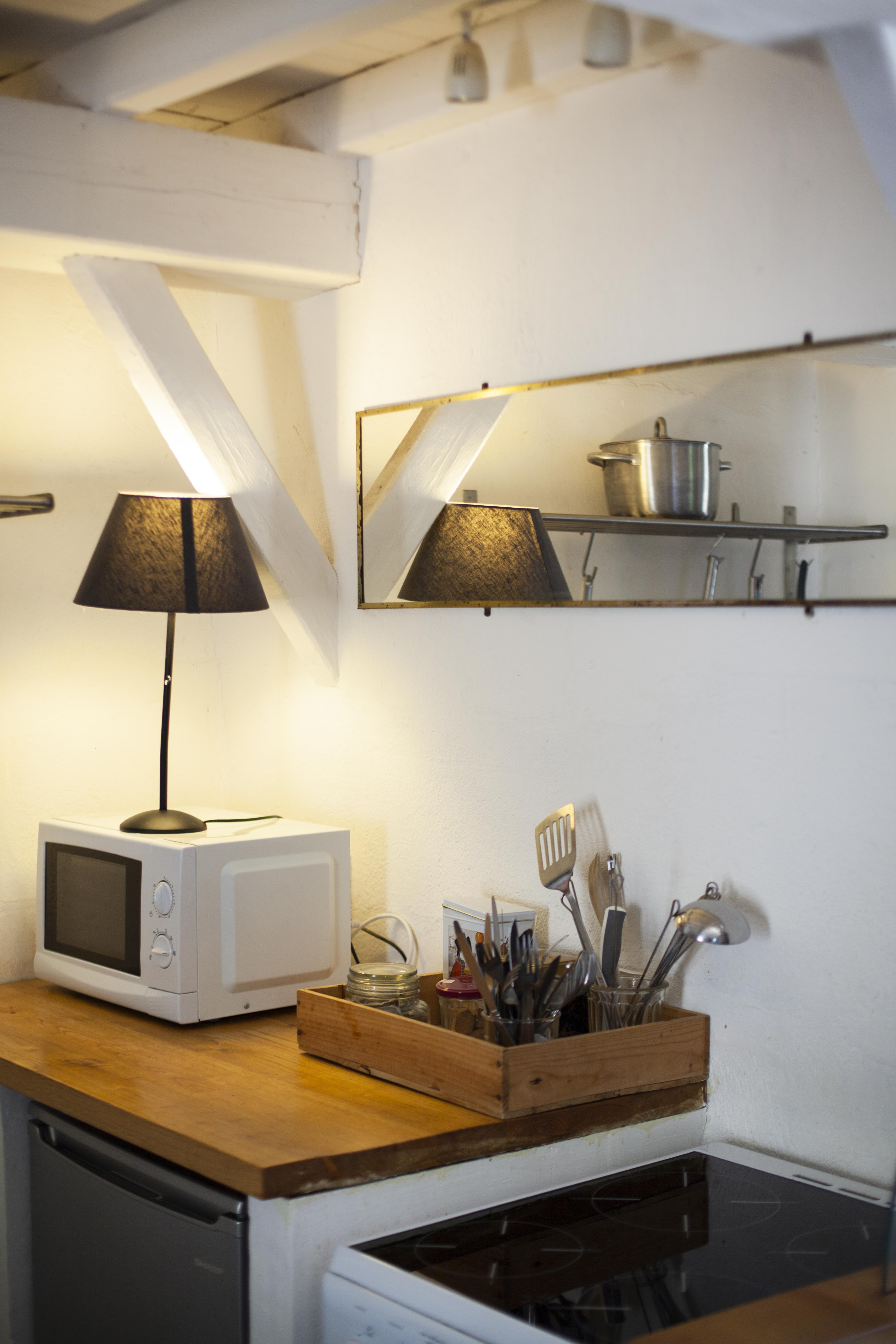 - Cuisine équipée (vaisselle, évier, réfrigérateur, …)